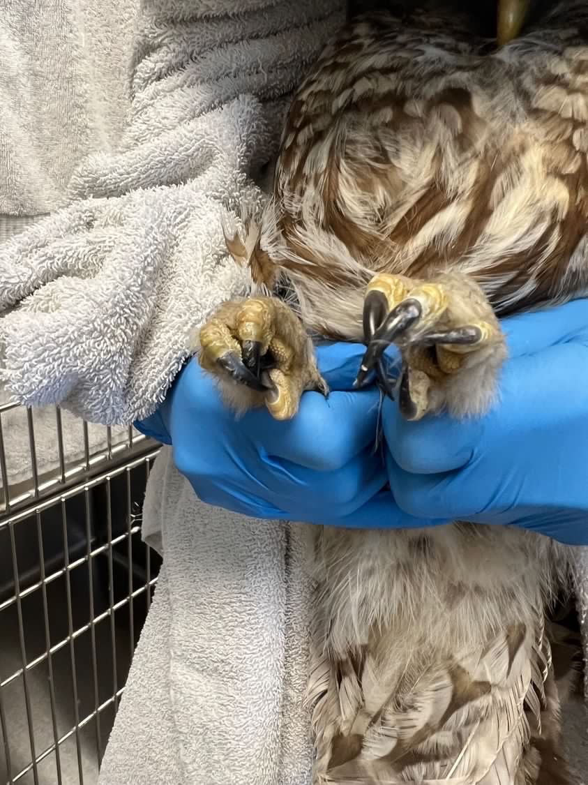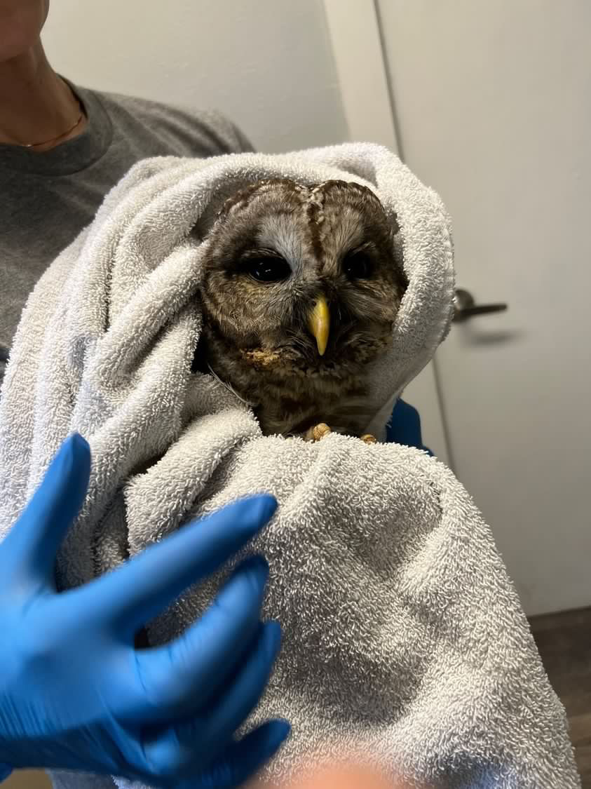 “Barred Owl 23-6 (our 6th patient of 2023) was brought to Think Wild on January 25 from Silver Lake, Oregon with a broken wing, possibly from being hit by a car. Staff determined it was a CMC (Carpometacarpal) fracture, basically the wrist bone of the right wing. We applied a wing wrap and treated the bruising and minor eye trauma. After three months in our care, this Barred Owl had recovered from his wing fracture and bruising, passed his live prey tests, and was released back to the wild in April 18.”