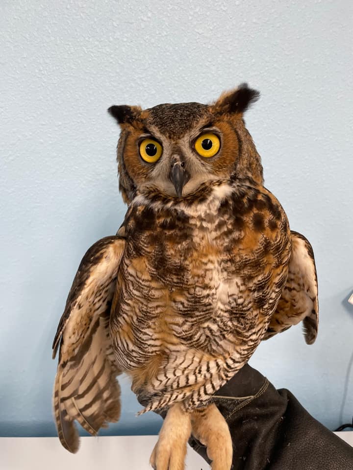 “This great horned owl found the end of Dec 2021 made a full recovery and was released back into his home territory (Sam Houston National Forest). We suspect he was suffering from some type of toxicity, but happily he responded to treatment. Once he felt better he spent about three weeks in a large flight enclosure to regain his strength.”