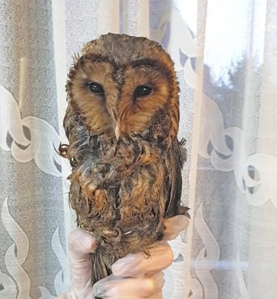 The barn owl fell into machine grease!
