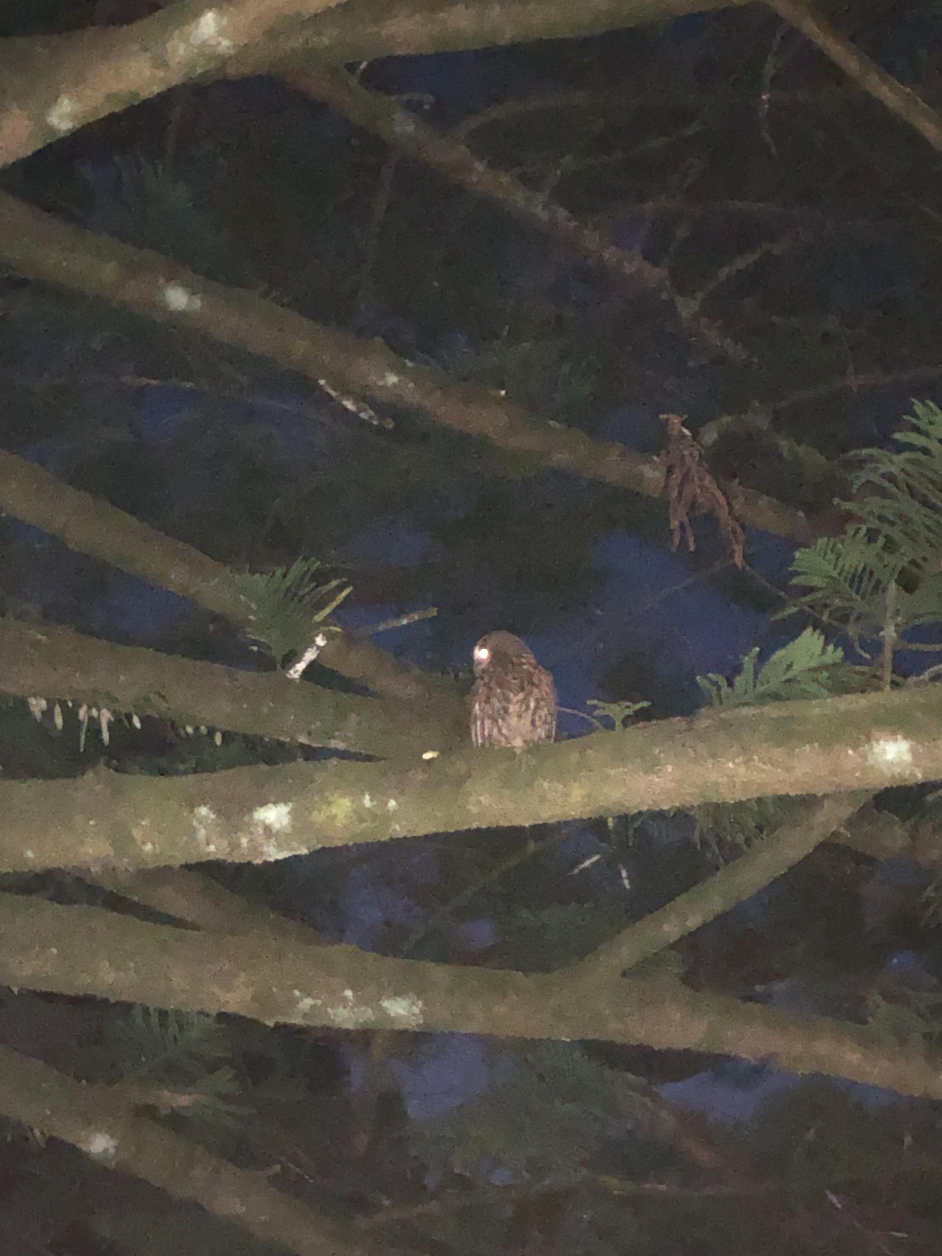 And here he is back in the wild! We released him in a wooded area close to the spot he was originally found. It was much too dark to get video, but a quick flash photo was enough to show he was alright, and that he’d found a satisfactory branch to perch on. Go well little buddy.