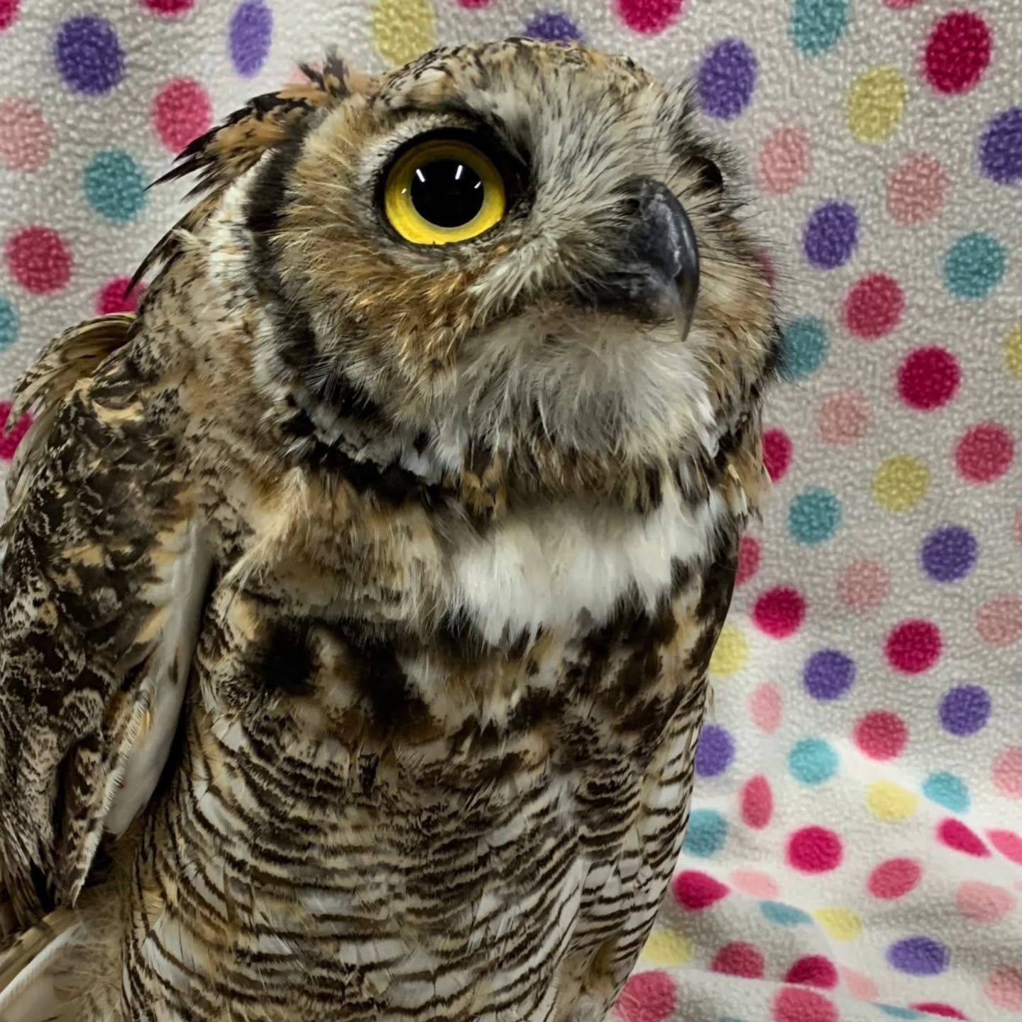 🪟🦉 This Great Horned Owl was admitted to our clinic after colliding with a window at the University of Regina. When it arrived, the owl was unconscious and suffering from severe head trauma. The injury was so significant that we had to administer anti-inflammatory and pain medication every 12 hours during the first week of care.