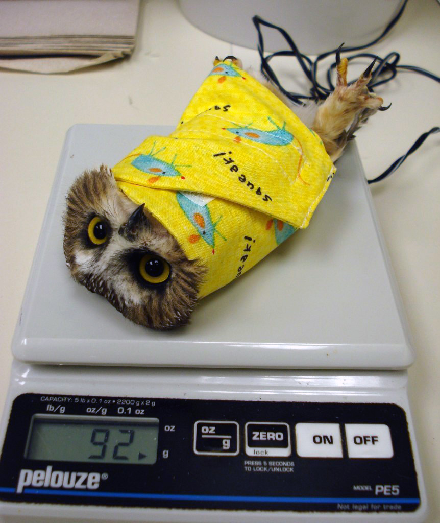 Why were these owls admitted? The majority of them suffered traumatic injuries from colliding with objects such as windows. Head and internal trauma were common injuries, but the bird pictured here suffered from a fractured pelvis. This adult female saw-whet was a restless patient, but after about two weeks of cage rest and one week of exercise, her energies were once again put into surviving life in the wild.