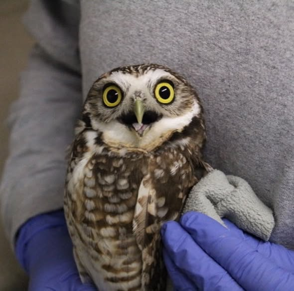 “Patient of the Week – Christmas owl – well he is actually a Burrowing owl and arrived on Christmas Eve. This poor guy was stuck in netting at a golf course in Renton and the people that found him couldn’t find anywhere to take him. They finally got in touch with a small mammal rescue place in Carnation, Footprints Wildlife. Kathi of Footprints called our Director on her cell phone at home, who then reached our Clinic Manager. Everyone was trying to make it to holiday events, but coordinating everything went smoothly and all had a peaceful night. Most importantly the little owl is now eating well and stable. He has an injured leg and our vet will be seeing him tomorrow. Thanks to everyone who took time that evening to help this adorable little owl.”
