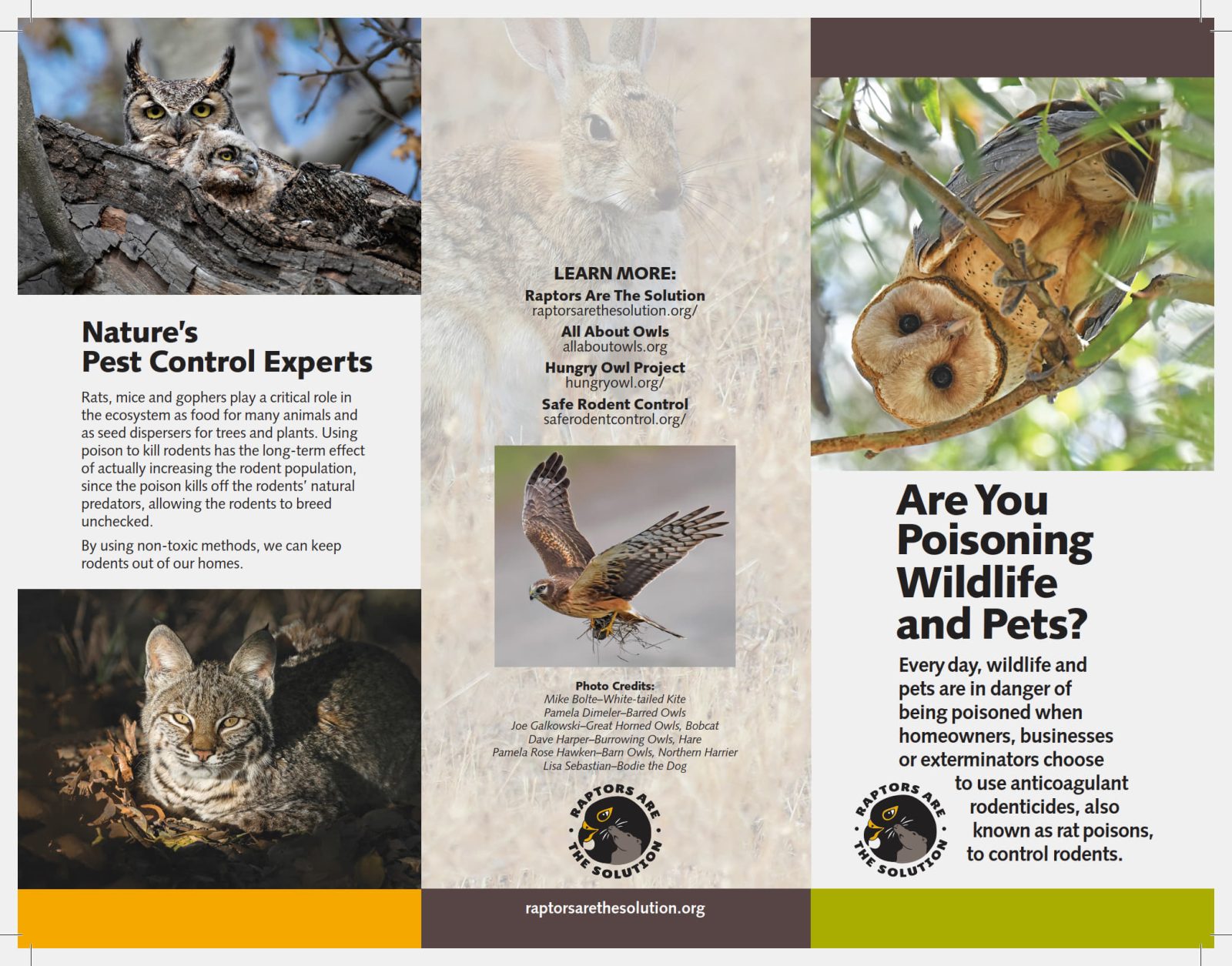 Pesticides, herbicides, and rodenticides find their way into the entire ecosystem and make their way up the food chain, harming wildlife like raptors.